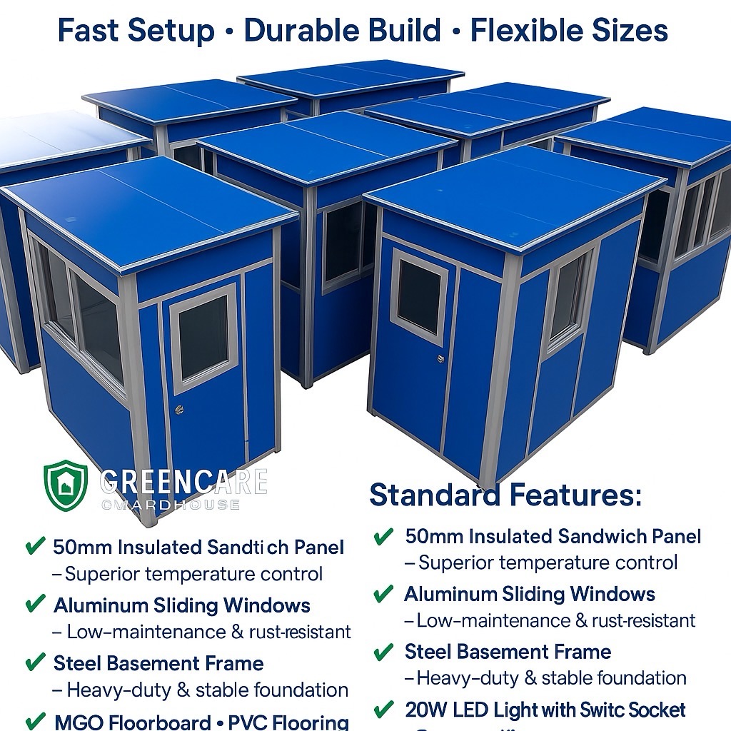 Enhance security and streamline operations with Greencare Prefab Booths β€” built for long-lasting use, portability, and quick deployment. Perfect for: